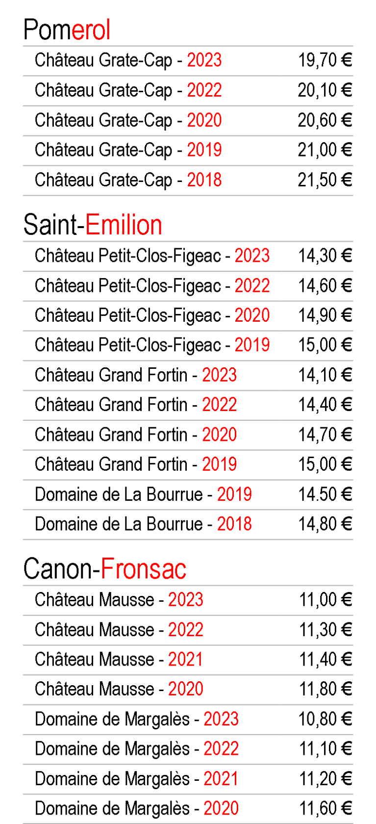 Tarif TTC 2026 par bouteille de 75 cl